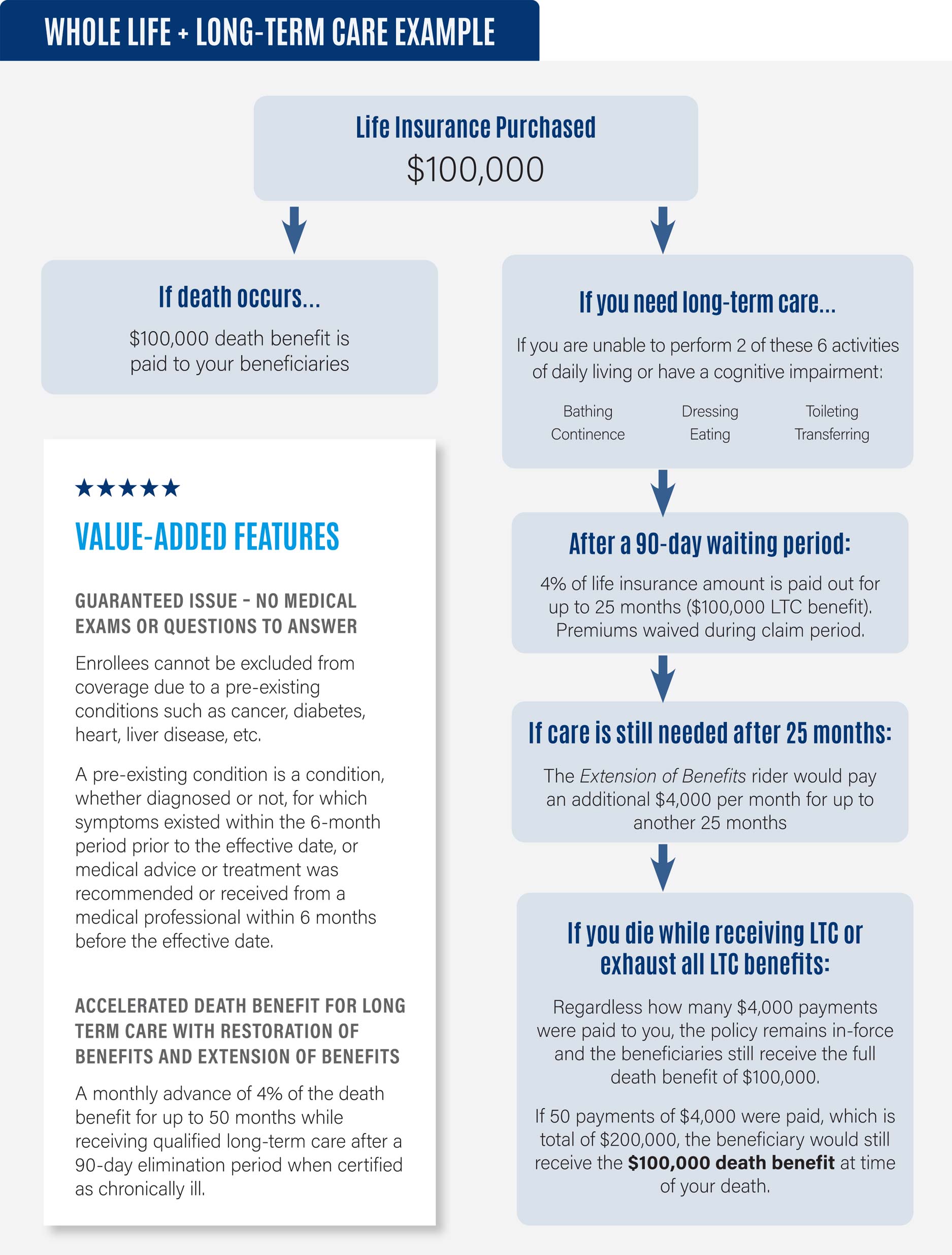 – Whole Life Insurance Long-Term Care Policy pays 4% per month for up to 50 months (4.2 years) if long-term care is needed. The following illustrates a $100,000 policy. The policy would pay $4,000 a month up to 50 months and the death benefit still pays.