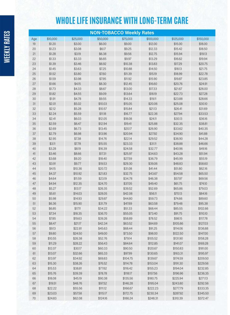 – Whole Life Insurance Long-Term Care Policy pays 4% per month for up to 50 months (4.2 years) if long-term care is needed. The following illustrates a $100,000 policy. The policy would pay $4,000 a month up to 50 months and the death benefit still pays.